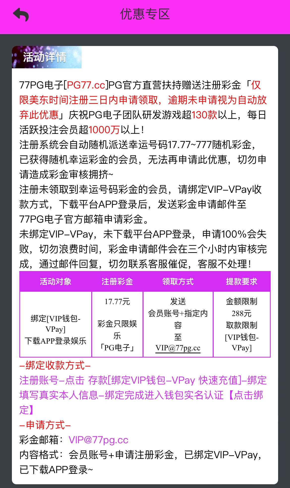 注册下载APP绑定VIP钱包/vpay,发送账号和指定内容到平台邮箱申请,288取款,只能用VIP钱包/vpay取款