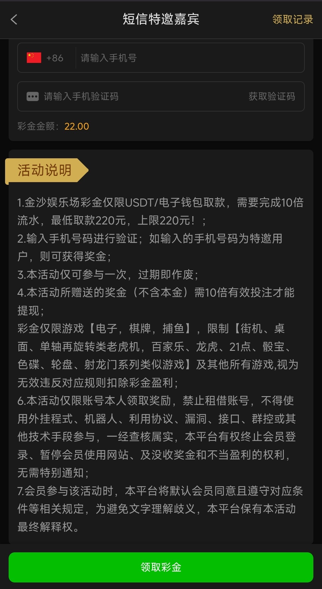 之前就有发过这个帖子还没有碰瓷过的哥们可以去试一下,注册好在优惠里点综合找到短信特邀在领取获取验证码领取,10倍流水,高低取款220,仅限电子/棋牌/捕鱼