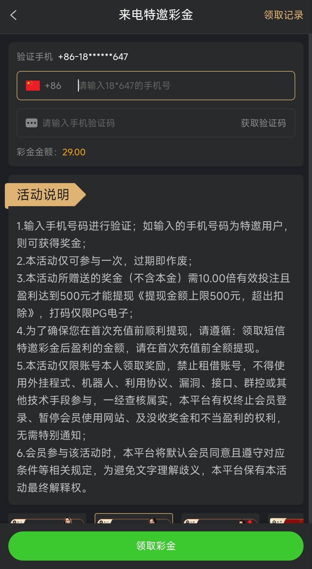 手机号注册绑定银行卡和电子钱包,等两分钟在优惠里特邀领取入口就显示出来了,10倍流水,限高低取款500,仅限PG电子