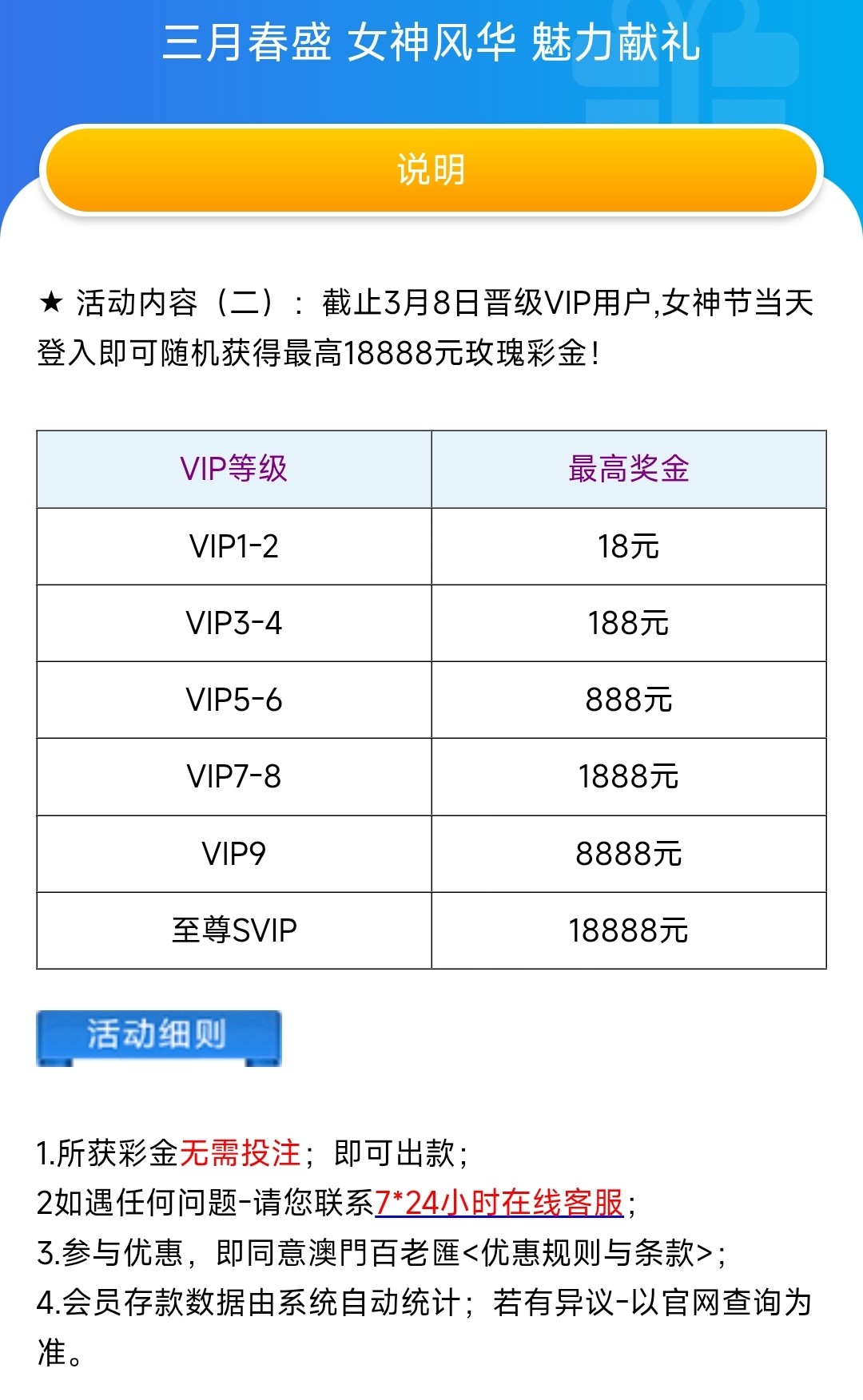 活动二在有VIP等级“8号”登入上领取彩金,没有流水可以直接提款,最低10提现